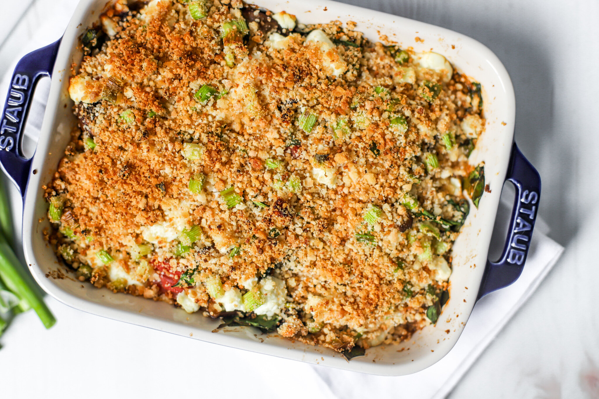 In a casserole dish, add in mushroom mixture. Top with dollops of goat cheese, followed by nutritional yeast, followed by the panko mixture. Put in oven for 10-15 minutes or until the goat cheese gets bubbly. Serve over grains (I love farro) and enjoy!
